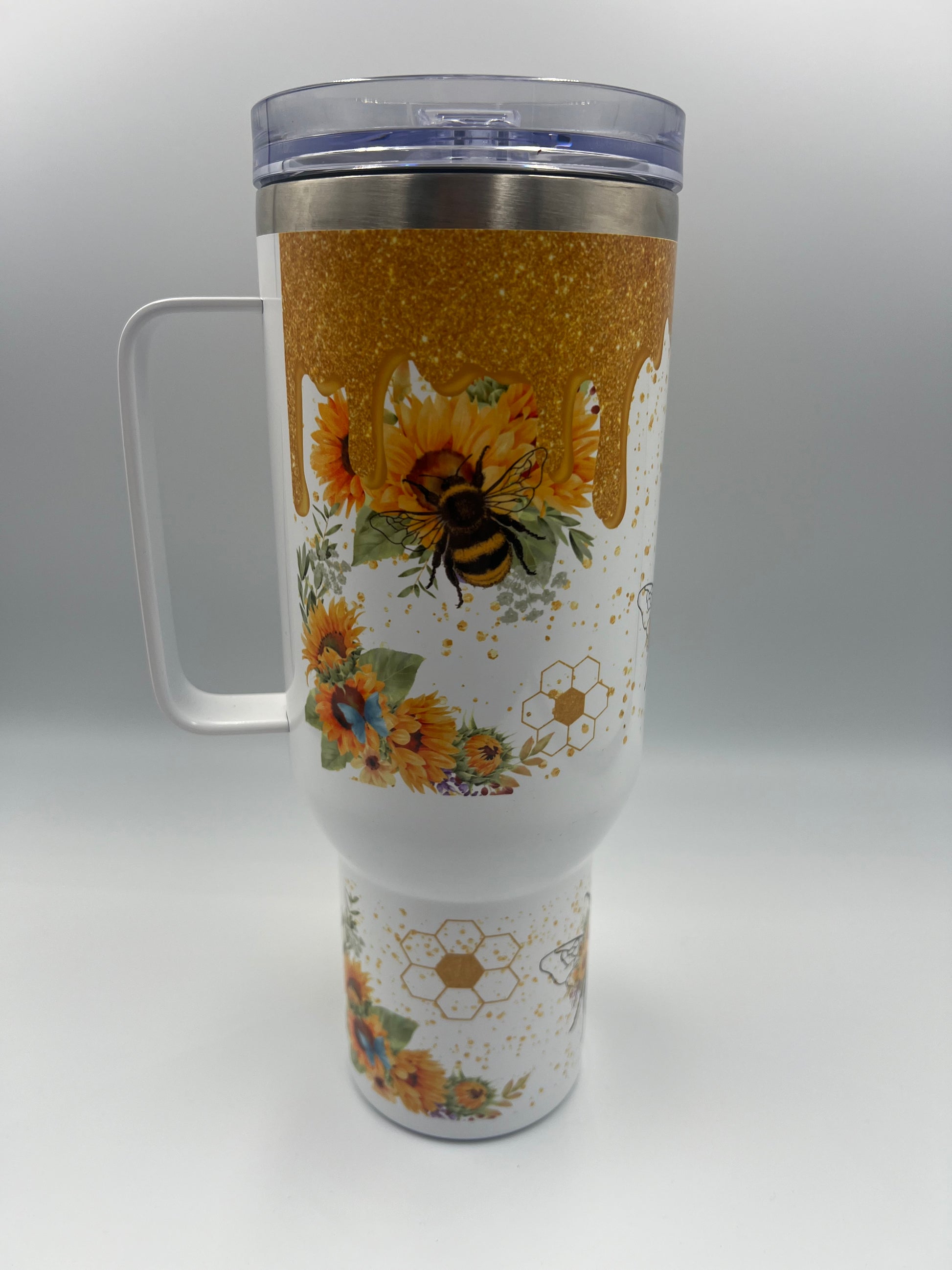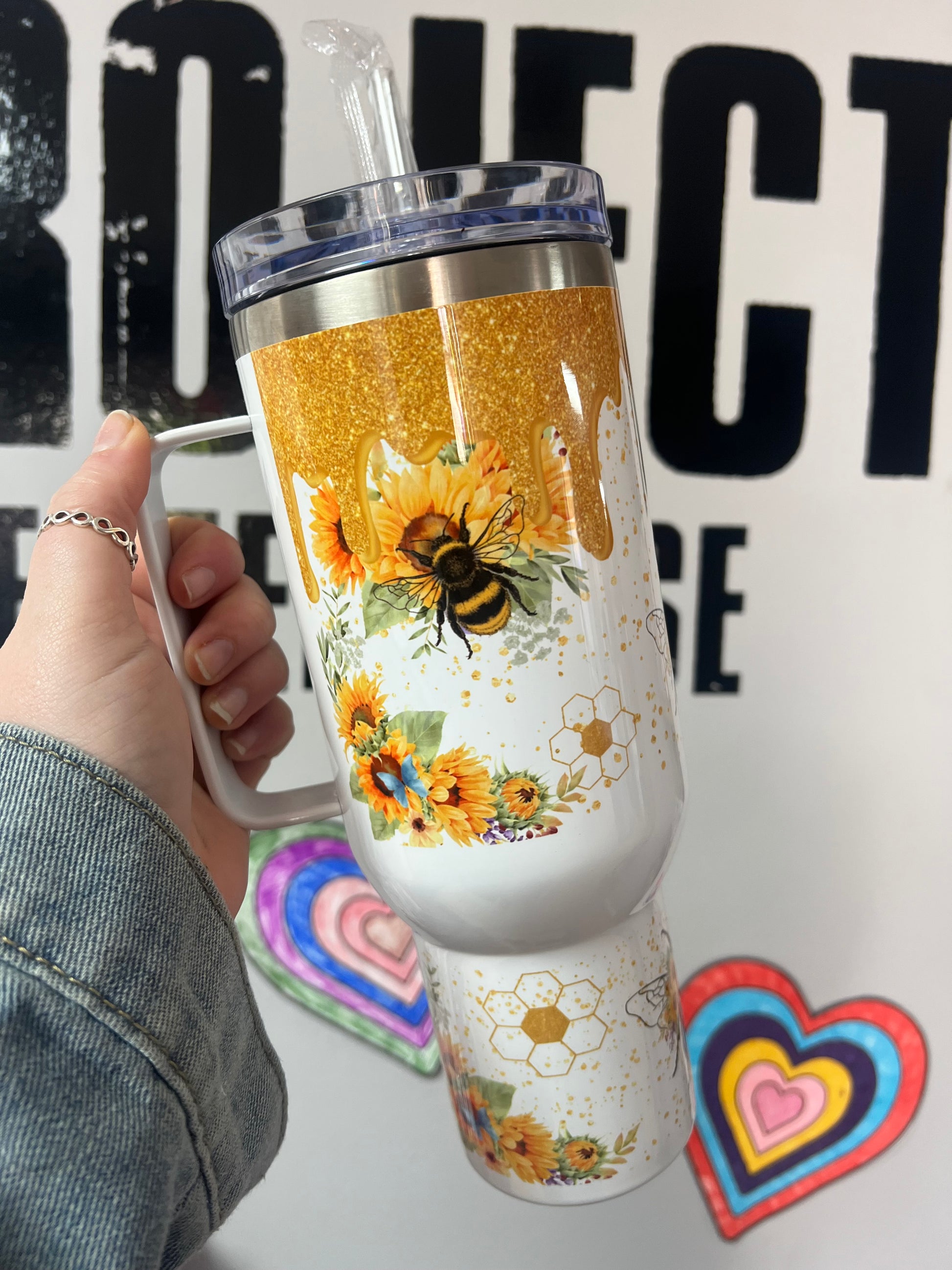 Experience the buzz with our Bumble Bee 40oz Tumbler! Designed with a playful bumble bee design and a honey drip effect, this large sublimation tumbler is perfect for enjoying both hot and cold drinks. Let this tumbler be your busy bee companion wherever you go!